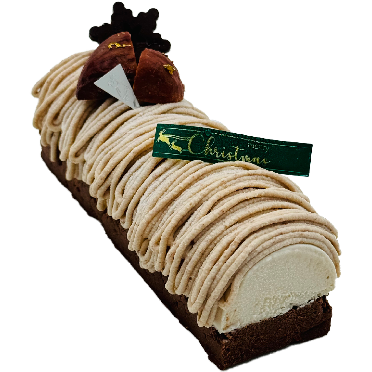 人気の小布施栗の渋皮煮モンブランをクリスマスケーキに仕上げました。ガトーショコラと塩ラム酒クリーム二層のフィリングにたっぷりの栗クリームを絞りました。メープルシロップで優しい甘味に仕上げた渋皮煮をトッピングにしたシンプルな中に華やかさのある大人のクリスマスケーキです。ギフトにも喜んでいただけますよう特別なお箱をご用意いたしました。
